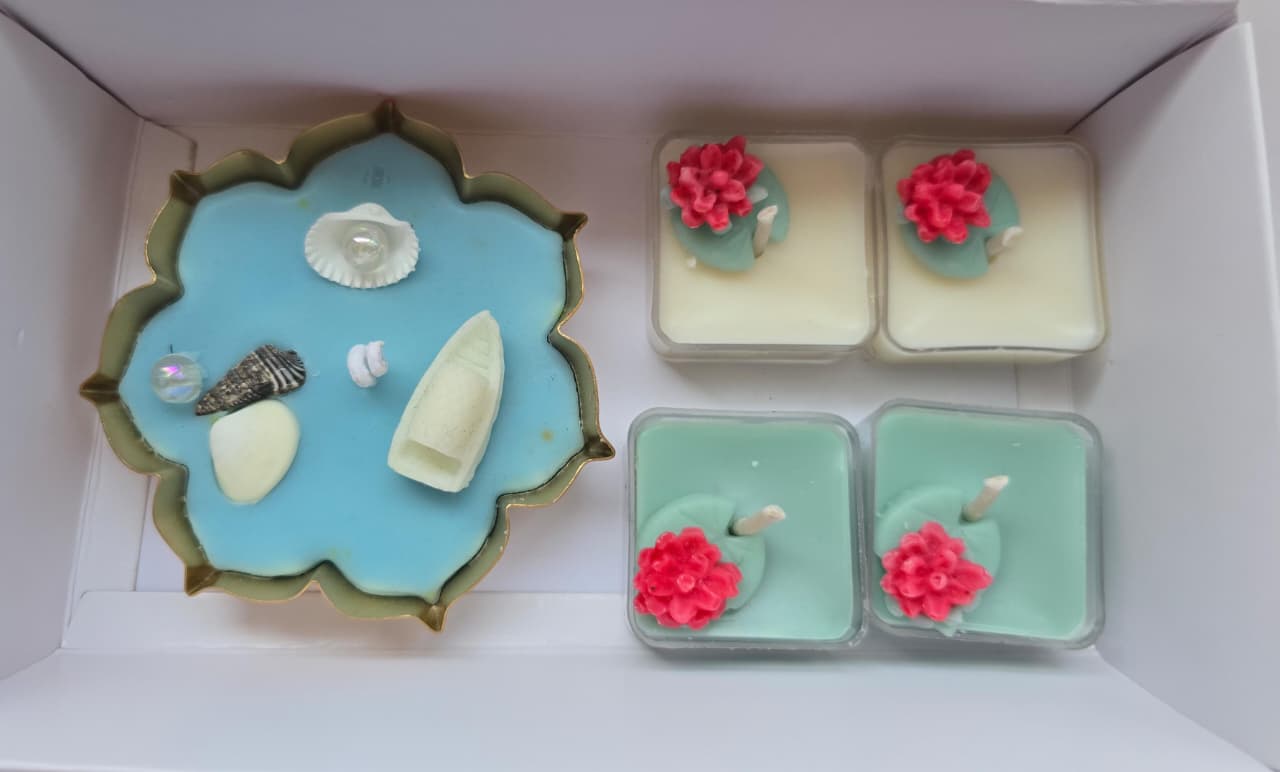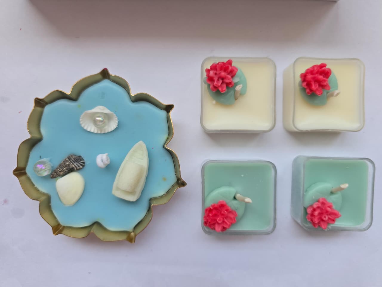 At the heart of this set lies a stunning ocean-inspired candle, beautifully adorned with seashell accents, evoking peaceful beach vibes and calm coastal moments. Complementing it are handcrafted mini candles, each topped with vibrant floral designs, symbolizing freshness, joy, and new beginnings.